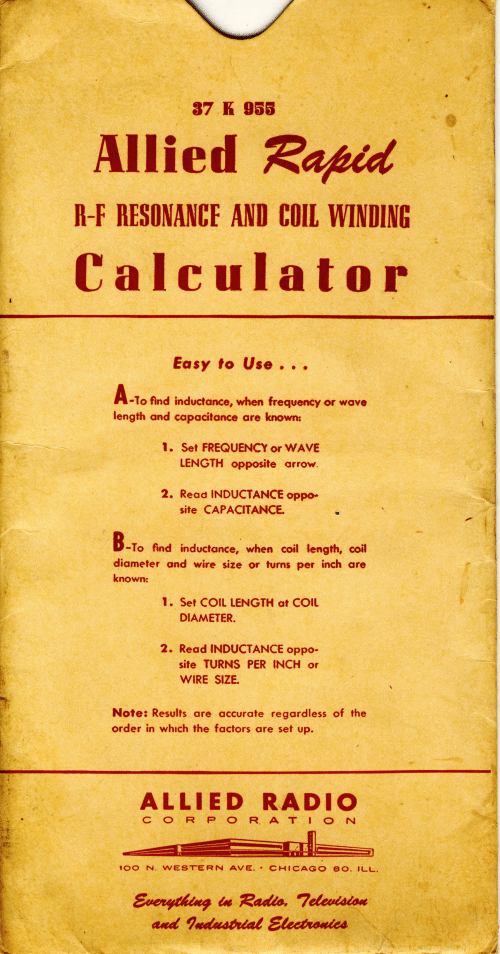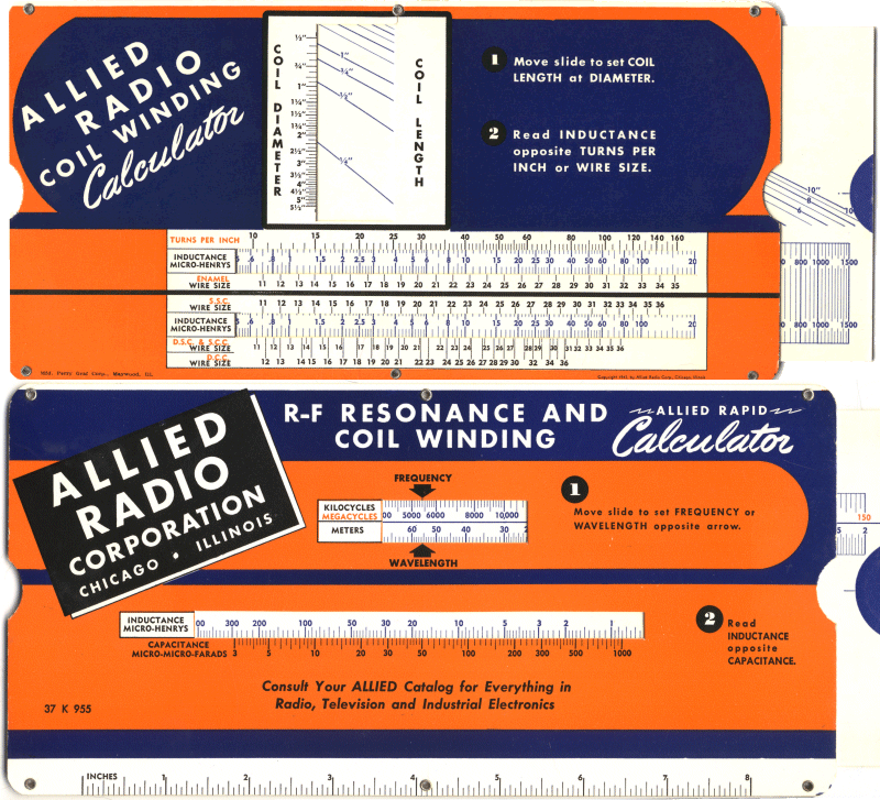 The other side calculates R-F Resonance and Ciol Winding. It has scales for frequency/wavelength and Inductance/Capacitance.