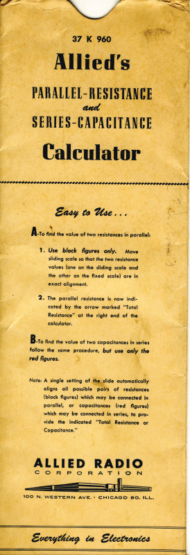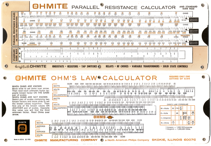 1970, Double sided. On one side it has several scales to compute Parallel Resistance. It also has a standard slide rule.