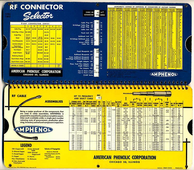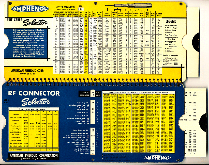 One card is a slide chart for selecting the proper Amphenol RF connector and cable, the second card provides a cross reference to RF cable, and cable assemblies.