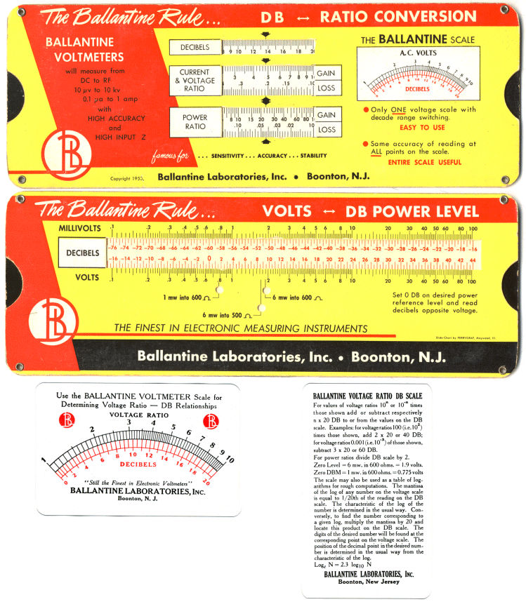 The Ballantine Voltmeter Scale Reference card with it has a scale to compare voltage ratio and decibels.