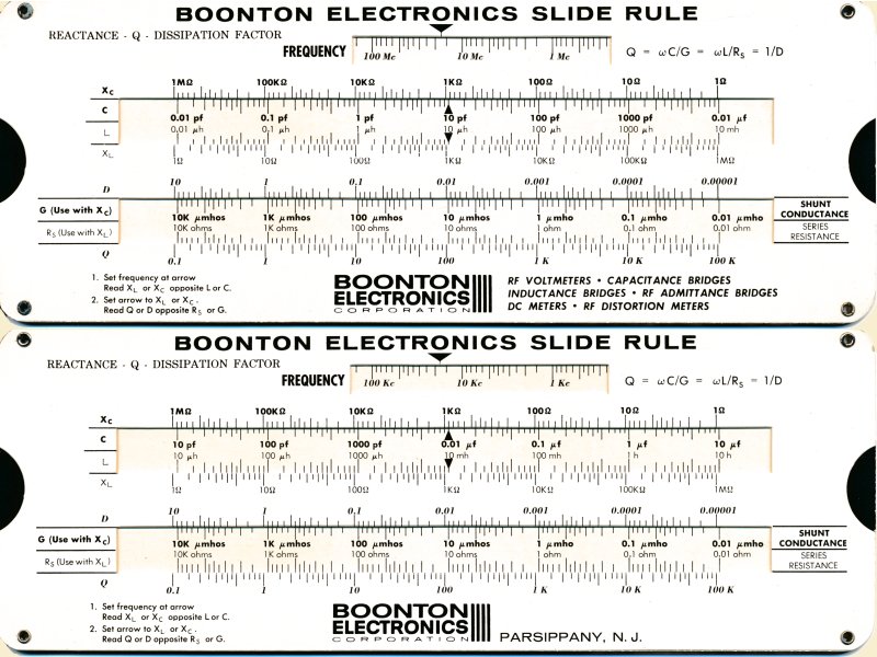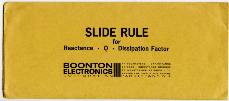 The Boonton Electronics Slide Rule is designed for rapid calculation of the reactance and either Q or dissipation factor of capacitors and inductors.