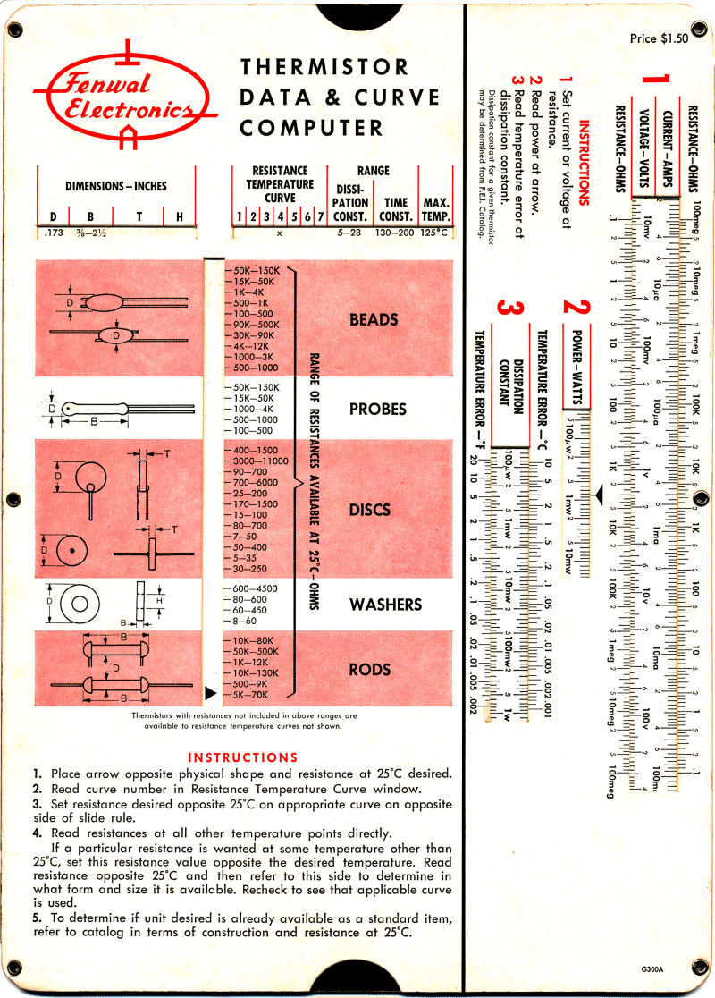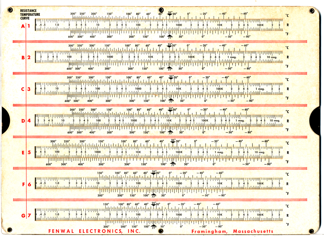 Front slide chart calculates resistance at various tempaturer points. Has scales for current, voltage, and resistance ranges.