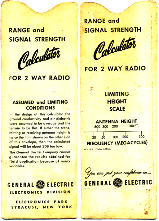 Front has slide chart for antenna height to key number and reverse has slide chart for megacycles and signal in microvolts along with key number calculated on front.