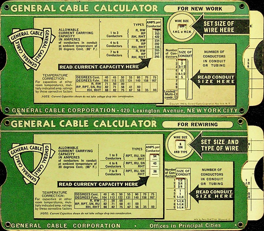 1940 General Cable Calculator - This two sided General Cable slide chart calculates wire and conduit size for current needed. Front is for new installations and rear is for rewiring.