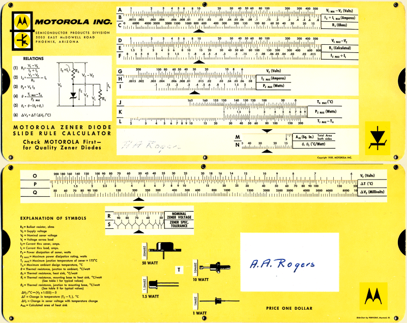 This Motorola slide chart calculates volts, amperes, and wattage of Zener Diodes.