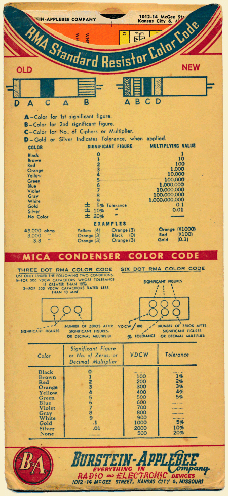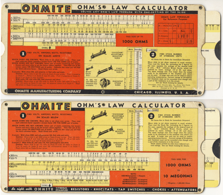 1941, Double sided. On one side it has scales to compute ohms law along with volts and wattage required up to 1000 ohms. The second side covers the 1000 ohm to 10 megohm ranges.