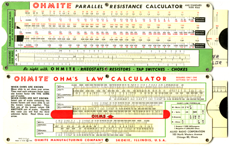 The other side is an Ohms Law Calculator. Both faces have a clear vinyl cover. Instructions are on slide.