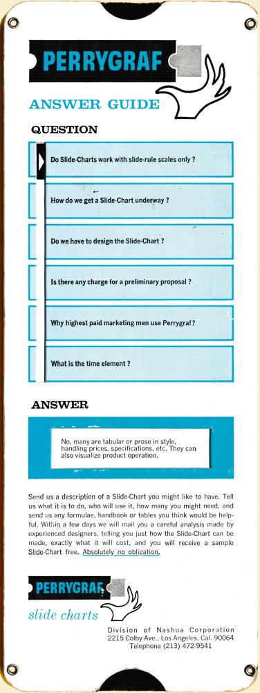 This is a Perrygraph slide chart advertising sample. The front is an Ohms Law Calculator and the back is a chart of questions and answers to Slide Chart ordering.
