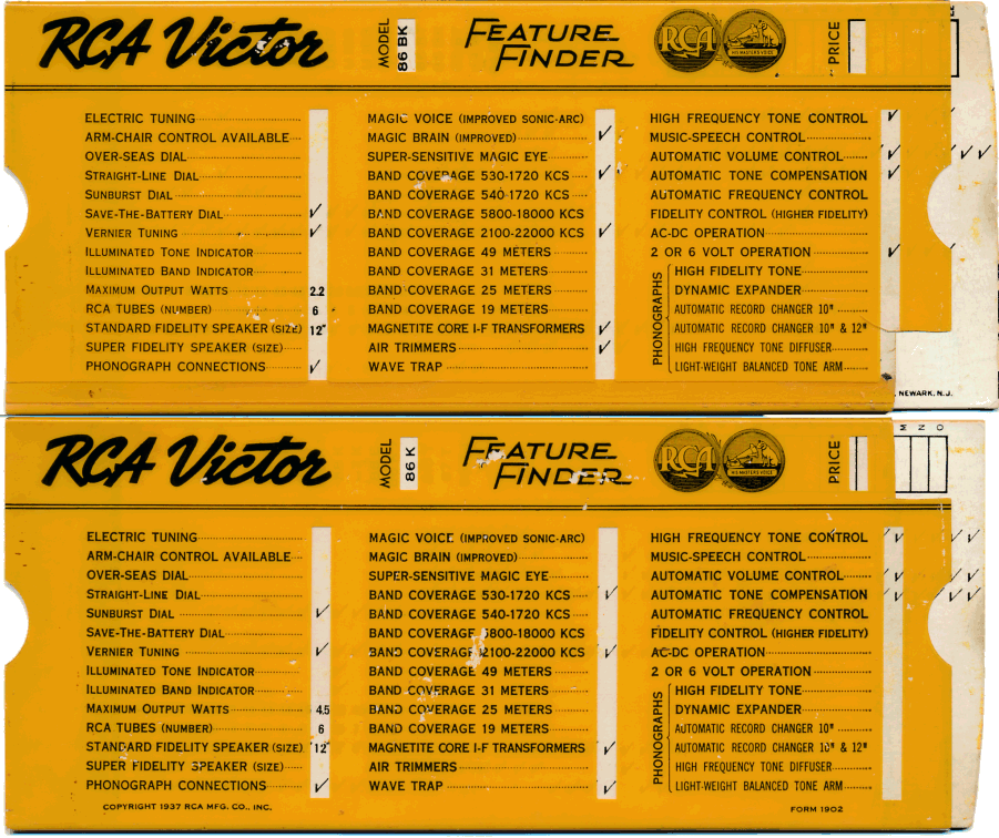 RCA Victor Slide Chart for finding fearures on RCA models of Radios and Phonographs in their 1937 line-up.