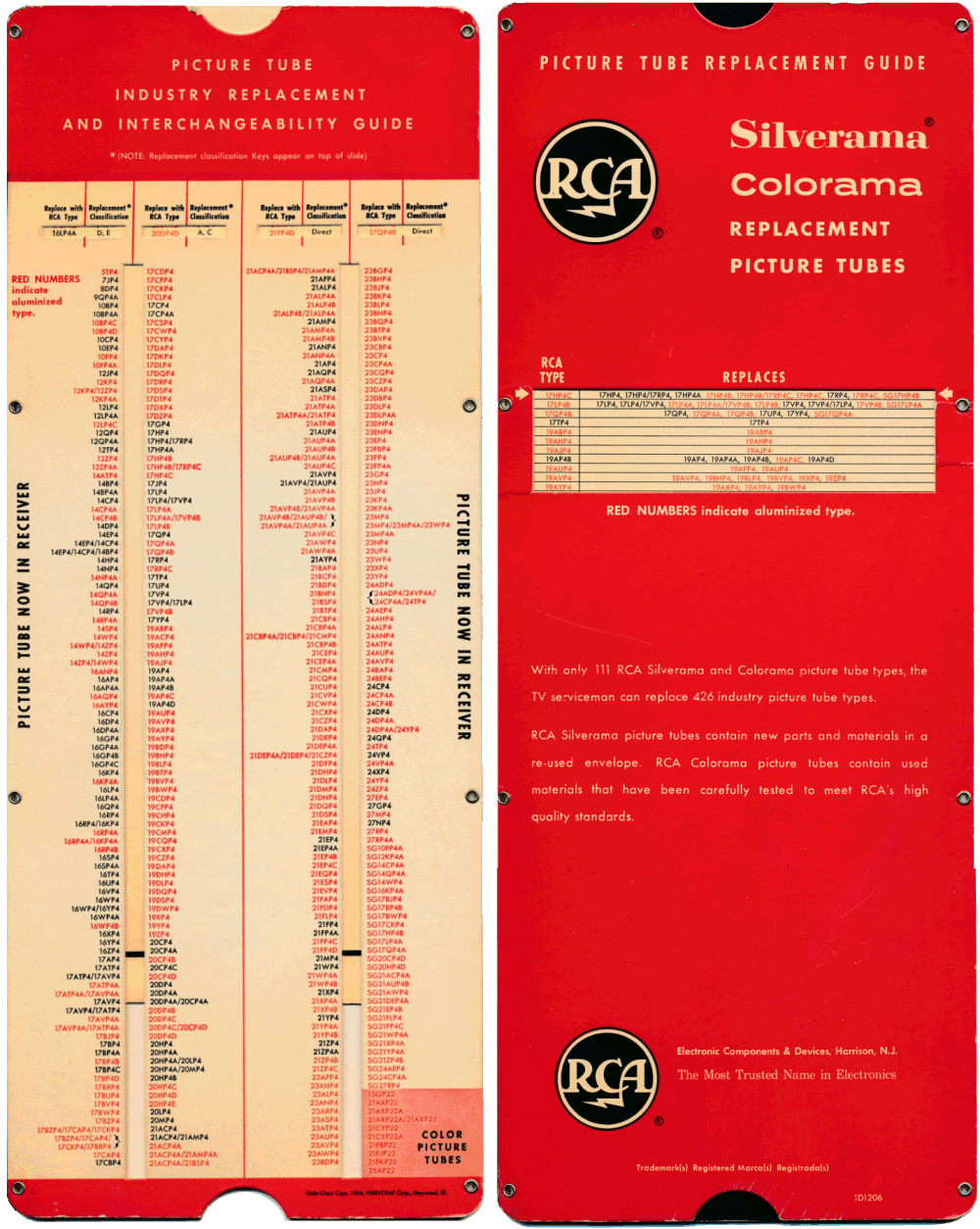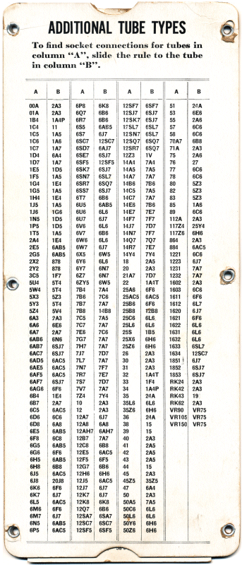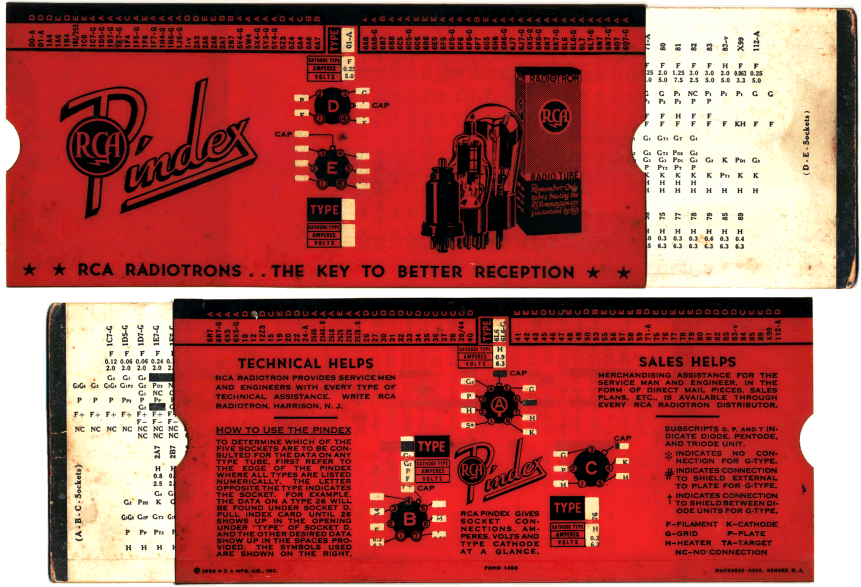 Double sided. Gives pin-outs and tube data for RCA Radiotron vacuum tubes on both sides with instructions on the back.