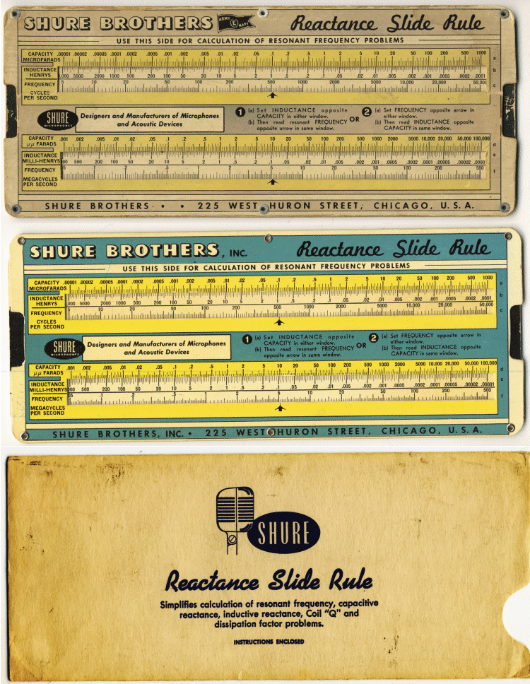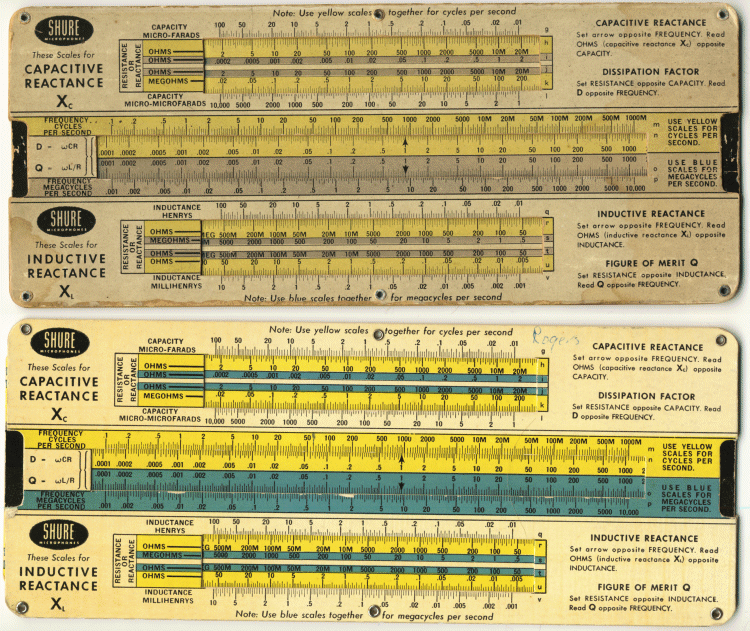These double sided slide cards were used to calculate the resonant frequency equation for microphones. On one side they have scales to calculate capacity, inductance, and frequency.