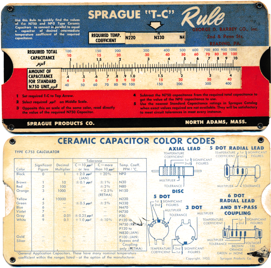 Slide chart for finding the values of N750 and NPO type ceramic capicitors needed for paralled circuits.The reverse side lists color codes and locations for ceramic capacitors.