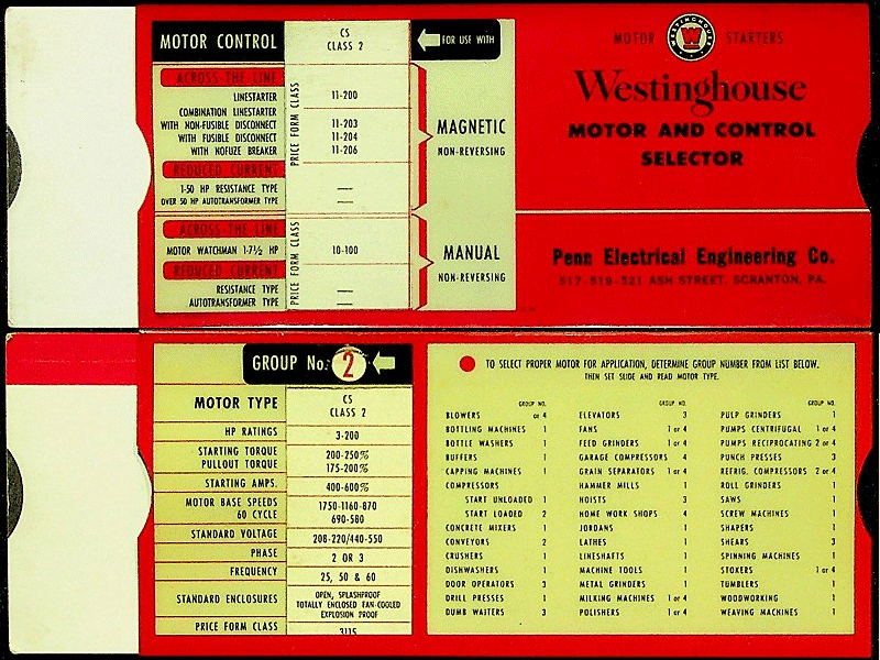Two sided Westinghouse Motor and Control Selector Slide Chart.
