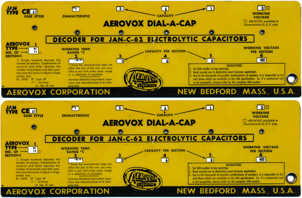 Double sided, one side for JAN-C-62 caps, other side for JAN-C-25 paper capacitors.