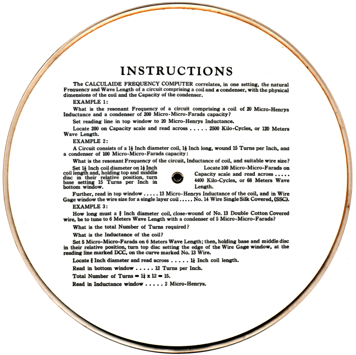 The Calculaide Frequency Computer wheel chart by American Hydromath Corp. was produced in 1955. It gives the frequency and wavelength of a coil and condenser circuit using physical dimensions of the coil and the value of the condenser.
