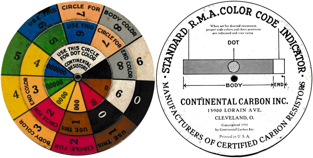 This 1931 dog bone resistor color code wheel chart from Continental Carbon Inc. shows resistance color markings for dog bone resistors.