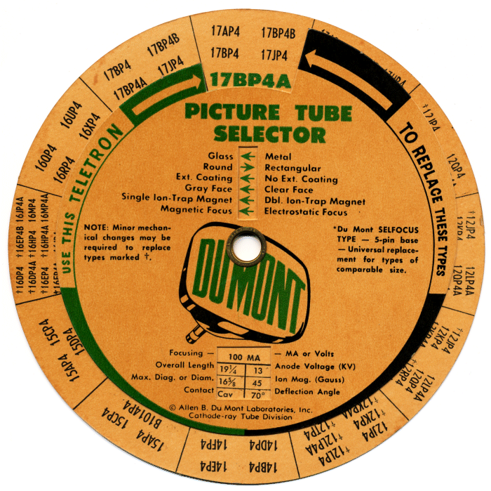 This two sided wheel chart shows Dumont replacement TV picture tubes and specifications.