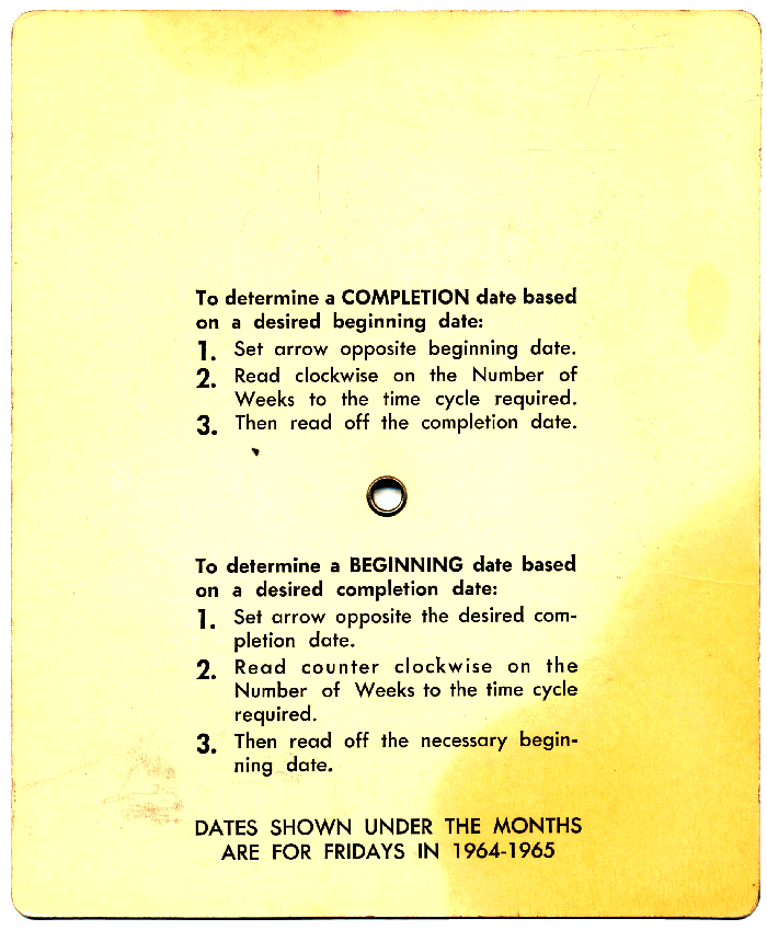 This small metal wheel calendar calculates dates by year and day of week from 1965-1992.