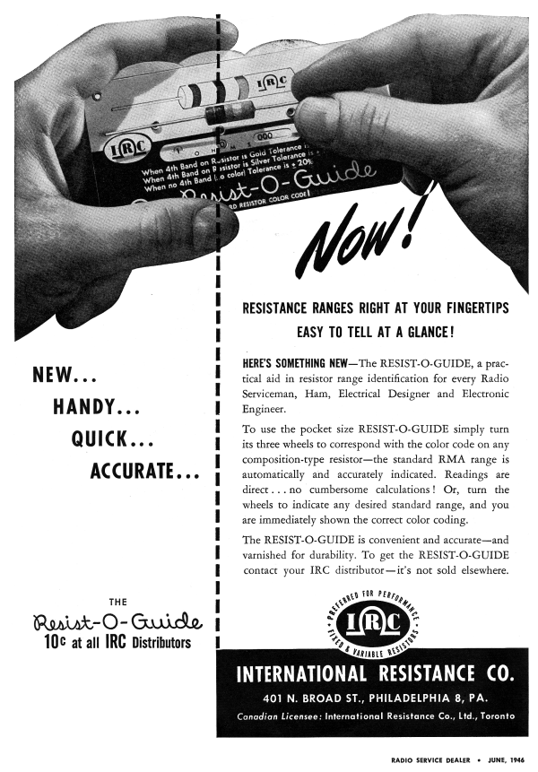 The 1946 Resist-O-Guide (Top Left) from International Resistance Company (IRC) shows the resistance color markings for standard carbon resisters.