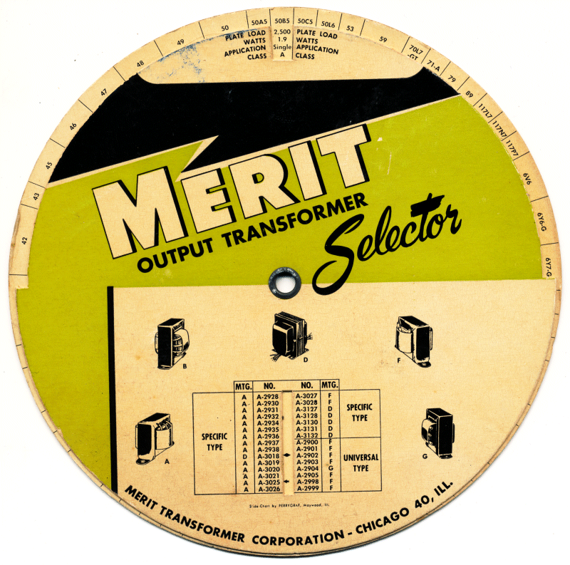 The Merit Output Transformer Selector allows you to select needed specifications on the top of the wheel. Merit part number and type are then indicated in the window.