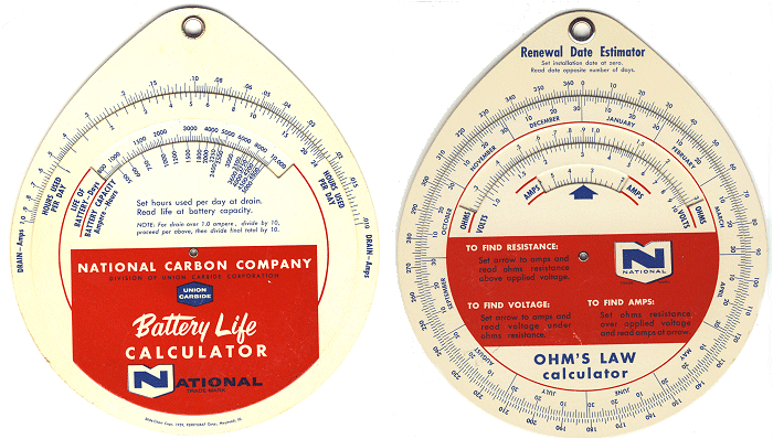 This wheel calculator has a dial on one side to compute OHM'S Law (resistance, voltage, and amps) and a battery life calculator on the other.