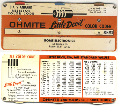 This small coder from Ohmite shows the resistance color markings for standard carbon resisters.