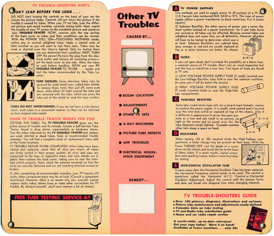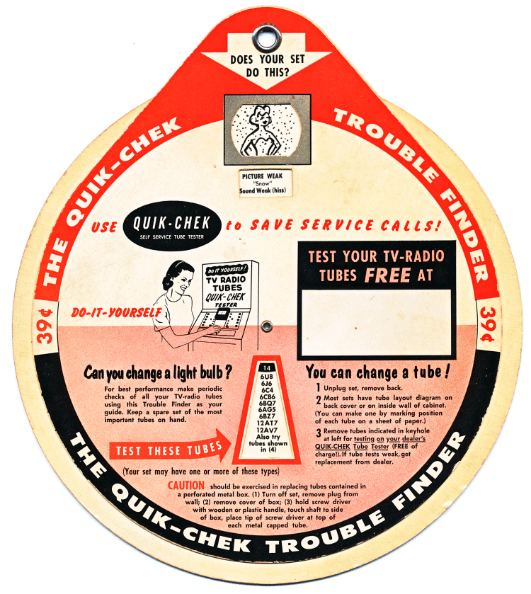 This two sided wheel chart from 1956 helps troubleshoot TV problems. Turn the wheel till your picture problem appears in the top window and read the tubes you need to test