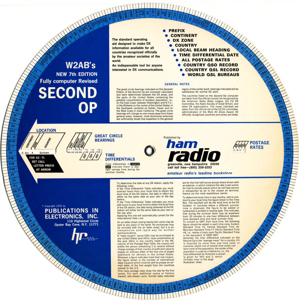 This large wheel chart (over 10" in diameter) calculates postage and lists addresses world wide for Ham Radio QSL card mailing.