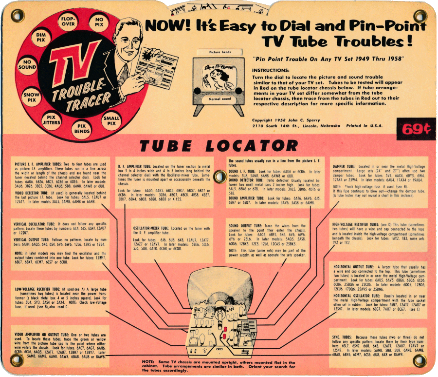 This Sperry TV Tube Trouble Locator wheel chart from 1958 helps troubleshoot TV problems and find which tubes need to be tested. Turn the wheel till your picture problem appears in the top window and read the tubes you need to test