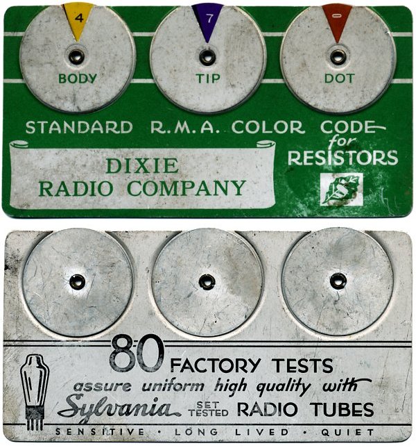 This 1932 Ohiohm R.M.A resistor color code wheel chart from the Ohio Carbon Co. Three color wheels show end and dot color markings for early resistors.