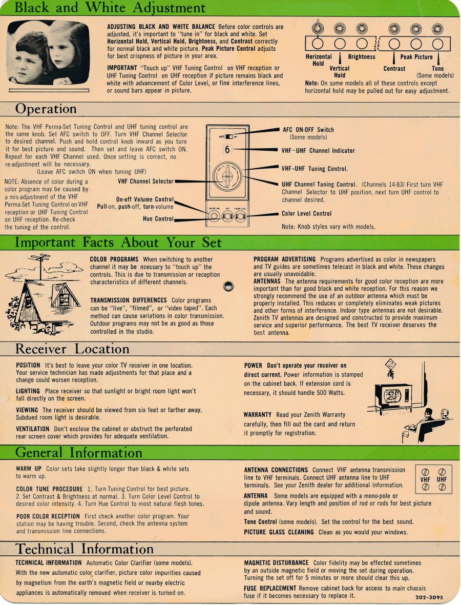 This wheel chart shows how to properly ajust the picture and color settings on early Zenith color Televisions. The back has general Color TV operating instructions and general information.