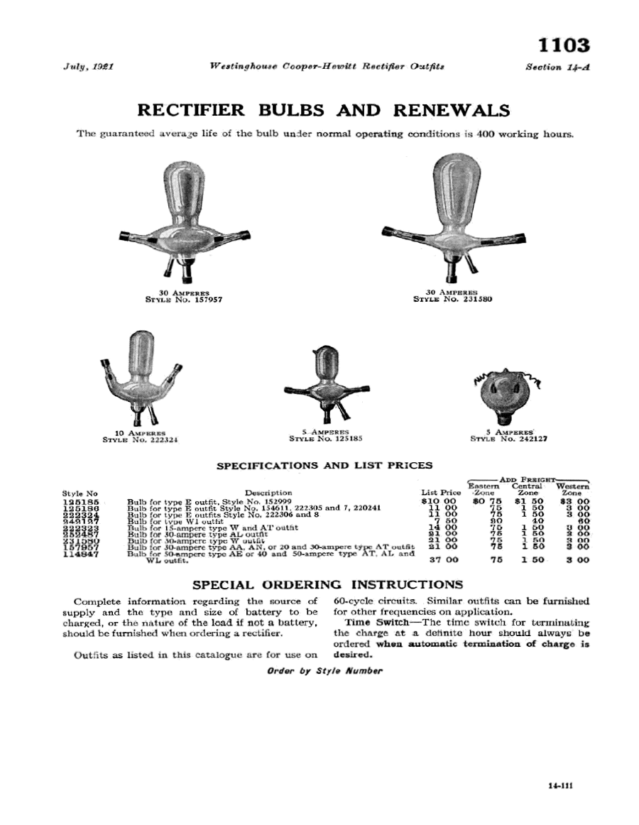 List price was $11.00 in 1921. This Mercury arc rectifier is 13 inches tall and 9.5 inches wide.