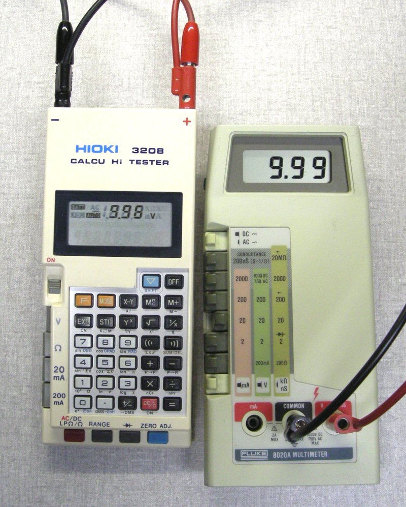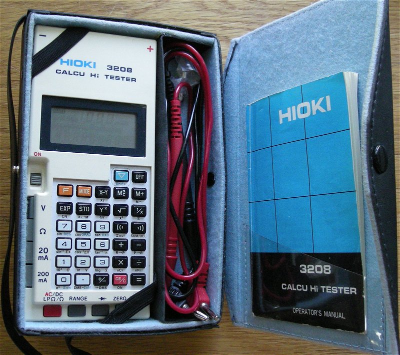 This Hioki model 3208 Calculator and DMM combination was sold around 1980. It's a unique combination of a calculator and Digital Multi-Meter (DMM) in one hand held unit. Not just both in the same package, the reading from the DMM will transfer to the calculator by pressing