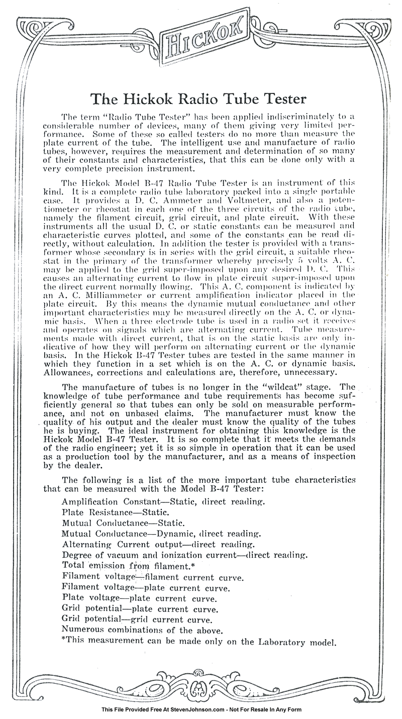 This need resulted in Hickok building his first dynamic mutual conductance radio tube tester, the B-47, which according to the original Hickok history web page, was most likely the first commercial radio tube tester.