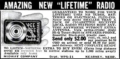 These portable Pee Wee pocket crystal radios were sold from the late 1940s through the 1950s. Ads for them were common in boy's magazines.