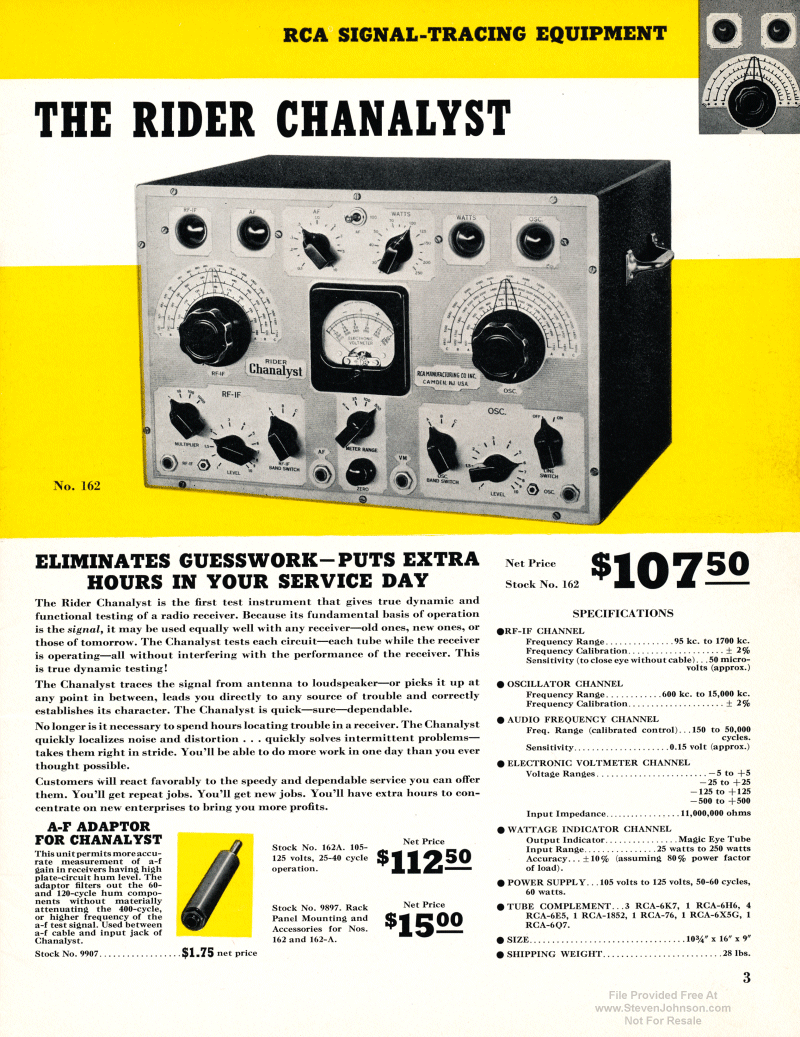 The Chanalyst was designed by John F. Rider to allow the serviceman to listen to and measure the signal as it passes through each of the components in a receiver.