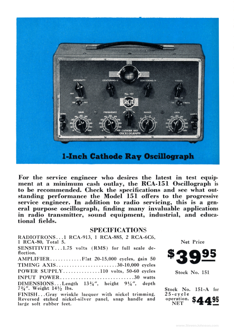 This is the RCA Test Equipment catalog #105 from 1940 showing drawings and descriptions with prices of