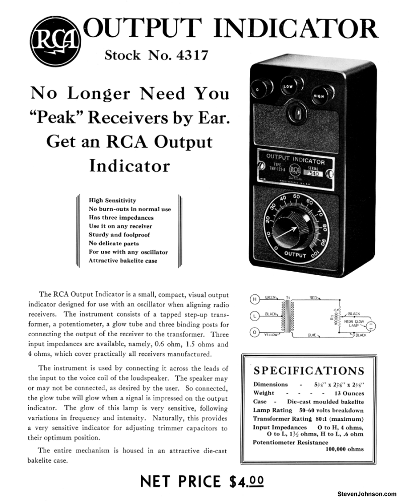 The Chanalyst uses four tuning eye tubes as indicators. Early Chanalyst models were manufactured by Service Instruments Inc. RCA manufactured and distrubited the later models of the Chanalyst.
