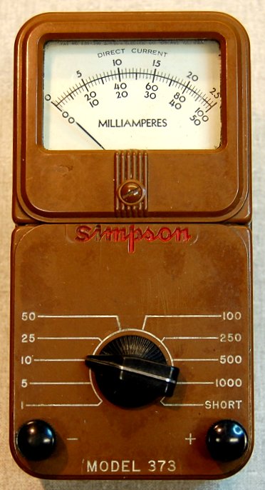 The Simpson Model 373 Milliamp Meter measures from one to one thousand milliamps in nine ranges.