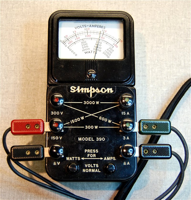 The Simpson Model 390 Volt-Amp-Wattmeter uses a "Break-in" plug/cable to allow an appliance serviceman