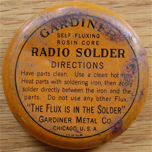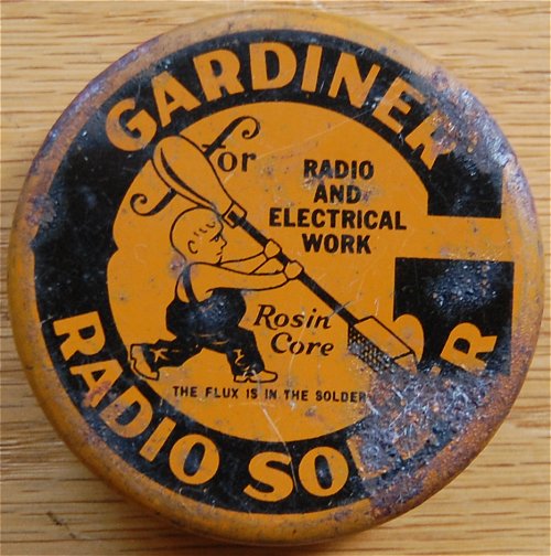This Gardiner Radio Solder Tin appears to be from the 1920s. Note the pre electric soldering iron pictured on the top.