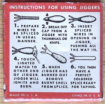Jiggers were used to to solder wires together using only a Jigger and a match. Twist the striped wires together and slide a