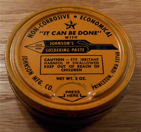 Johnson's soldering paste tin. Instructions are on side of tin. "Clean metal. Apply Paste. Heat. Add Solder, Preferably Johnson's Pure Solder."