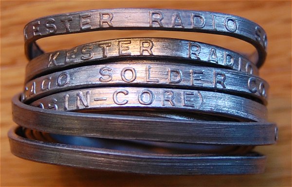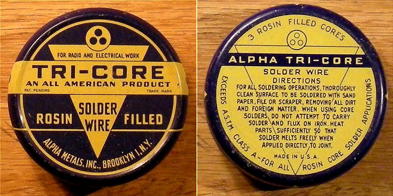 The original rosin core solder contained in the solder tins above is actually flat with raised lettering.