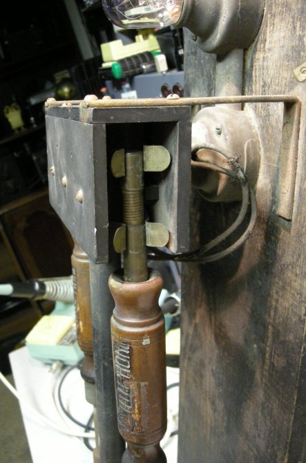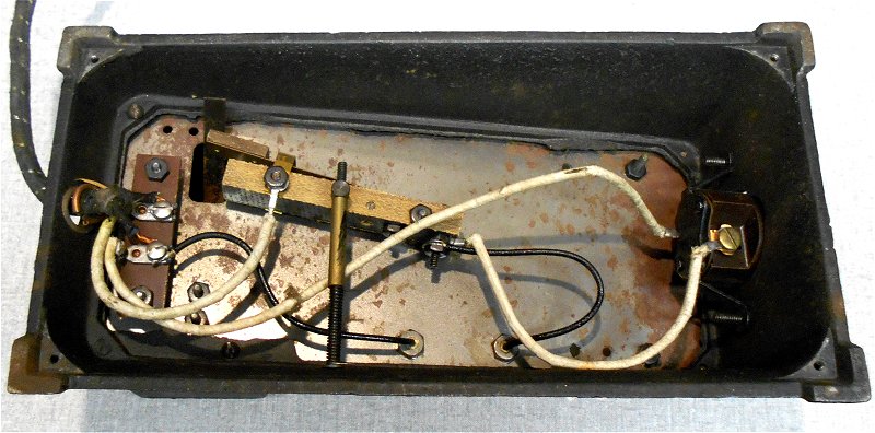 Current is turned on and off using screw contacts inside the spring loaded wooden foot pedal. The pencil carbon shown in the holder is not original but it fits exactly so I am guessing the original would have been similar.