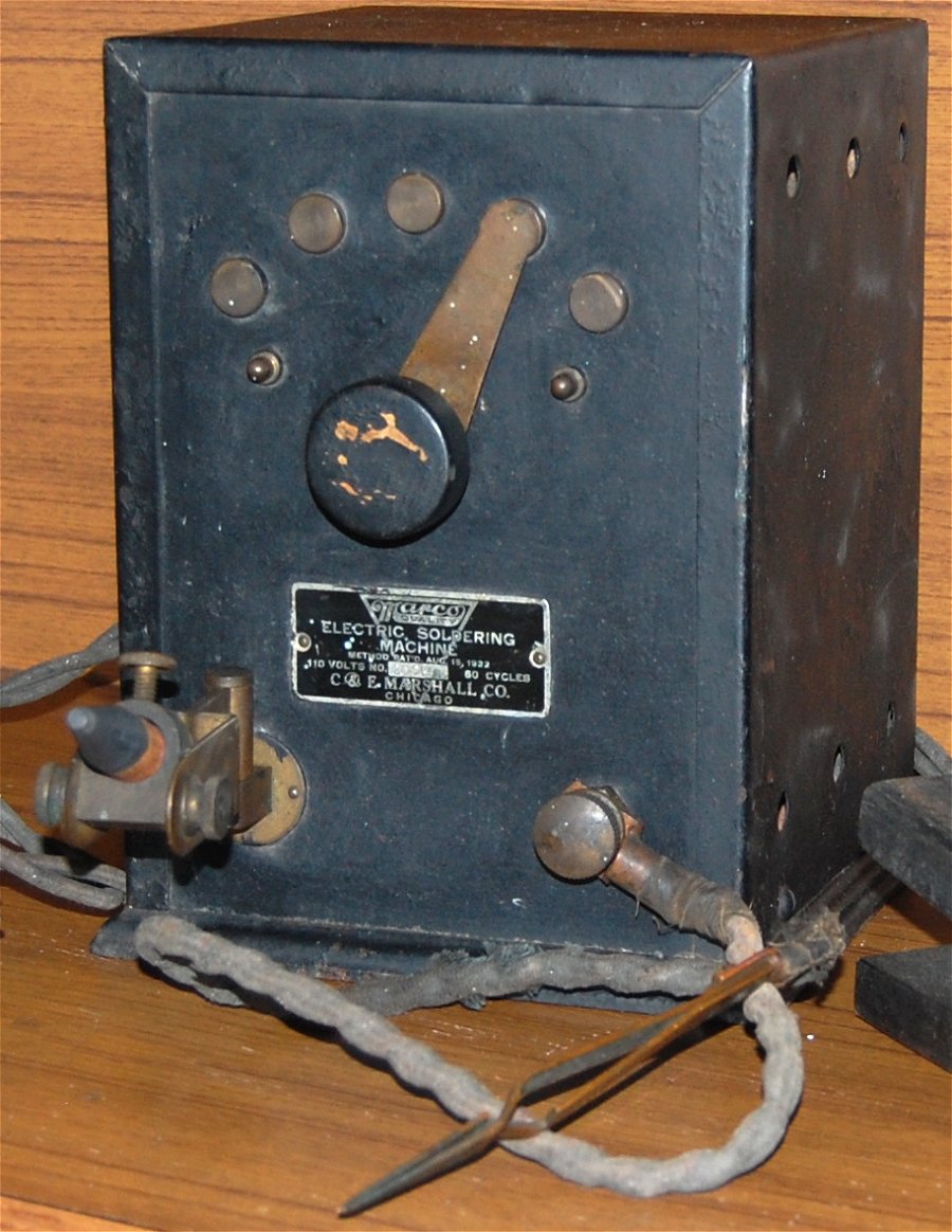 This early electric soldering machine used a pencil carbon and copper tweezers to pass current through the item being soldered. The large transformer housing has five levels of voltage selected by the large knob and brass contacts on the front.