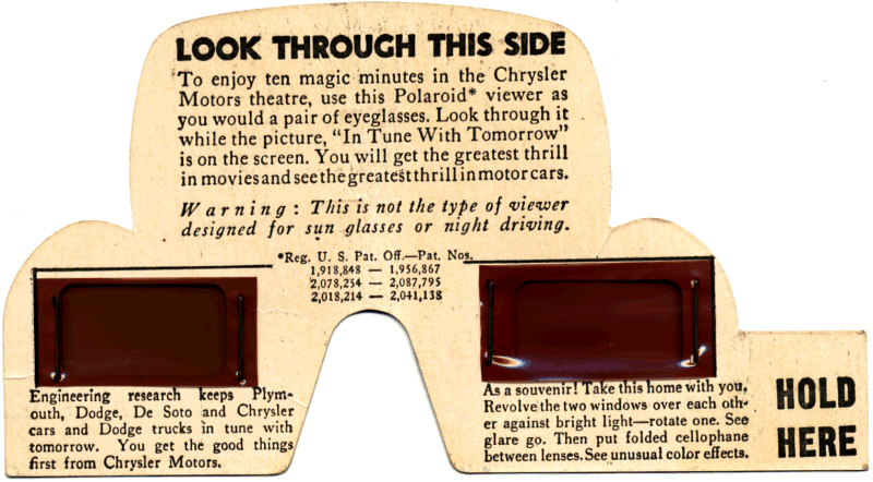 These 3D glasses were handed out by Chrysler to view their "In Tune With Tomorrow" 3D movie at the 1939 Worlds Fair.