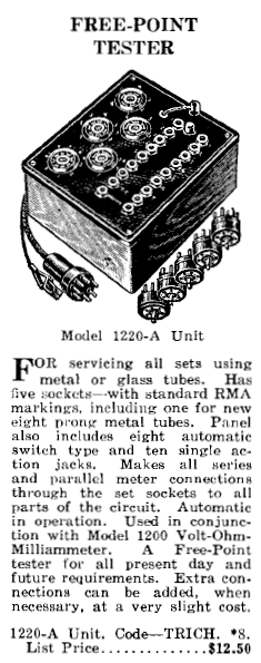 Used to allow in circuit point testing of tubes using a Volt-Ohm-Millammeter. Provides sockets and jacks for parallel meter connections.